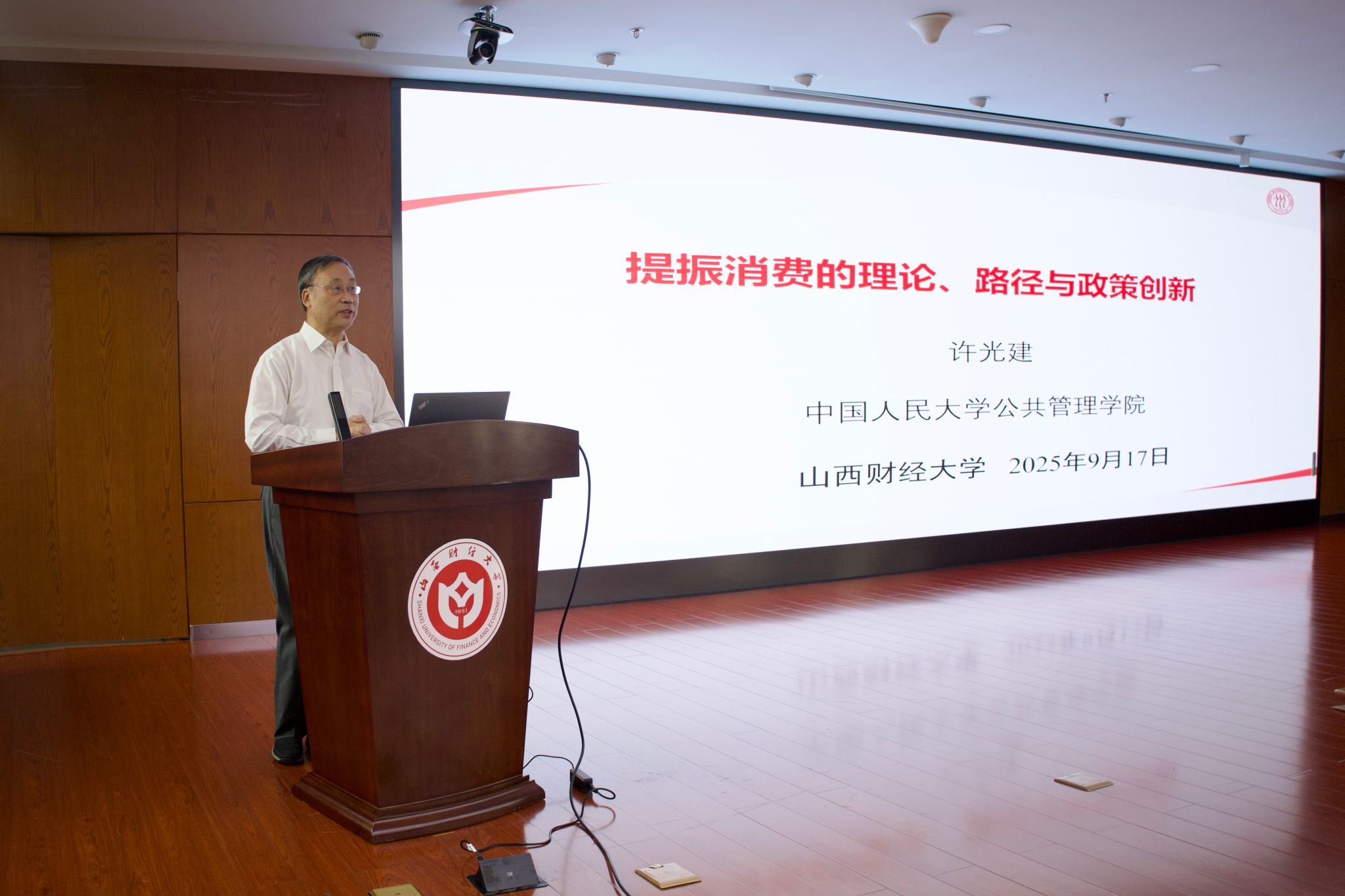 9月17日下午,财政与公共经济学院名家讲堂在图书馆东馆一层报告厅成功举行。中国人民大学公共管理学院公共政策系教授、博士生导师许光建受邀作了以“提振消费的理论、路径与政策创新”为主题的学术讲座。许光建教授兼任中国价格协会副会长、中国宏观经济学会常务理事、中国市场监管学会常务理事等职务,曾任人大公共管理学院常务副院长等职。长期从事宏观经济理论与政策、财政理论与政策、价格理论和价格政策等相关研究,是国务院政府特殊津贴获得者,也是我校1977级计划统计专业的校友。校党委常委、副校长米子川教授主持本次讲座,学院教师与部分研究生参加讲座。