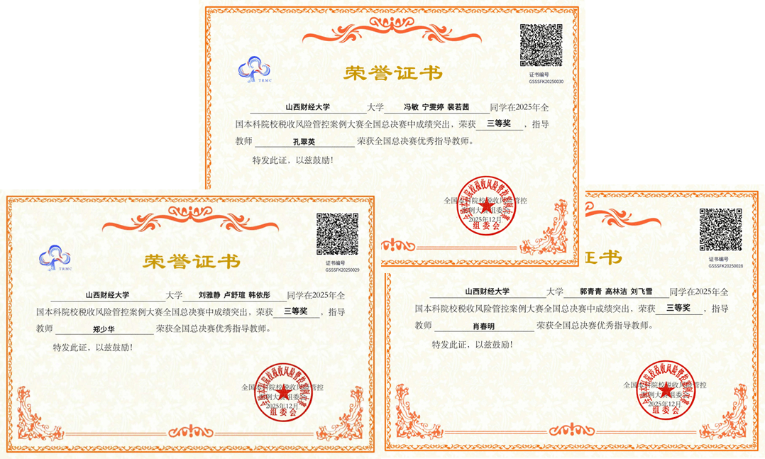 2025年12月6日,由浙江财经大学承办的2025年全国本科院校税收风险管控案例大赛总决赛圆满落幕。全国本科院校税收风险管控案例大赛迄今已成功举办七届,被纳入《全国普通高校学科竞赛排行榜》,是目前全国本科院校中参与人数最广、规模最大、影响力最强的财税类专业竞赛之一。本届大赛覆盖全国31个省(自治区、直辖市),共吸引434所院校、4340支队伍、13020名选手报名参赛,累计收到作品3831份。经过校内赛、分区赛的严格选拔,最终180支队伍脱颖而出,晋级全国总决赛。我校财政与公共经济学院3支队伍成功晋级全国总决赛并获得三等奖。