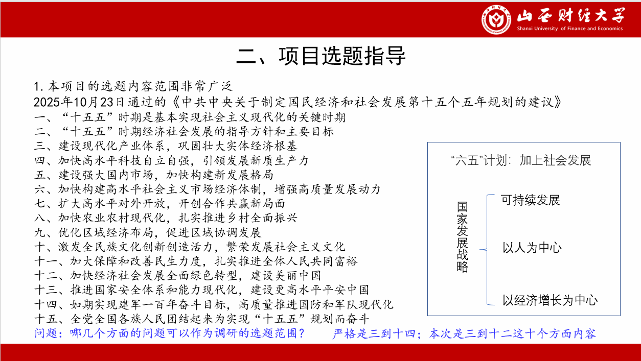 在对本项目的内容与实施流程进行简要介绍后,李老师根据《中共中央关于制定国民经济和社会发展第十五个五年规划的建议》的战略导向,为学生进行了专业的项目选题指导。李老师鼓励同学们既要响应国家重大战略需求,又要从经济与社会生活实际出发,做到“顶天立地,以小见大”。李老师通过生动的案例分析与互动交流,引导学生坚持问题导向,将社会热点转化为可操作的调研课题,为同学们明确研究方向提供了清晰而有效的指引。