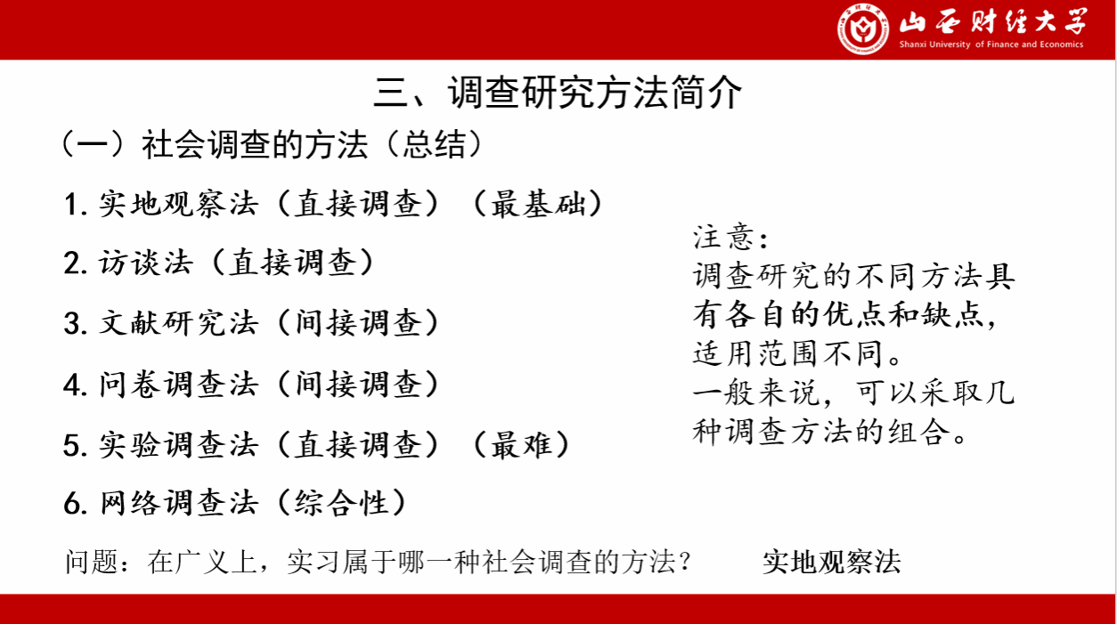 在系统讲解选题原则后,李老师围绕“什么是调查研究”“为什么要进行调查研究”和“怎样进行调查研究”进行调研方法指导。李老师结合案例说明了调查研究的重要性;通过比较六种不同调查方法的特点、适用范围及场景,结合实例分析了各类方法的选择与运用要点及注意事项,帮助学生学会运用科学方法开展实践活动。
