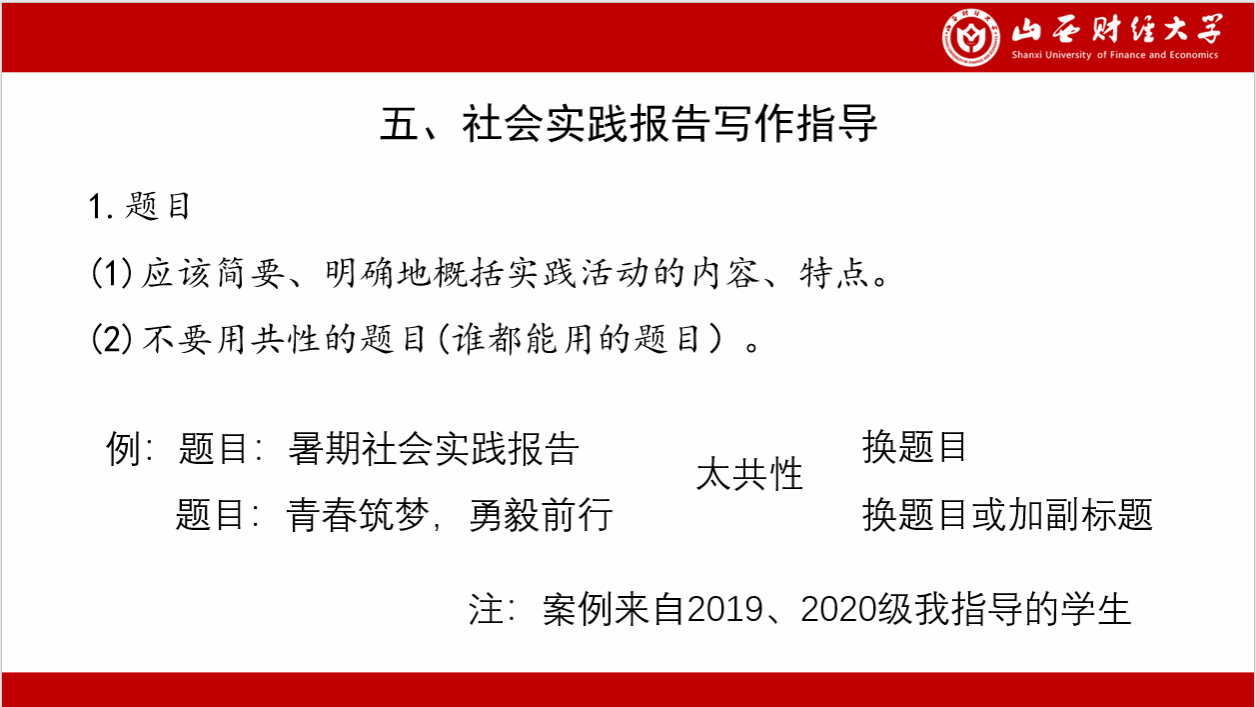 在方法论讲解的基础上,李老师进一步阐述了调研实施的五个阶段,即“选题-准备-调查-研究-总结”,并且指出了不同阶段的重要性和任务要求。进而,李老师说明了项目作业的提交要求和评价标准,特别对社会实践报告的写作进行了详细的讲解,并展示了社会实践报告的优秀案例,为同学们开展系统化、规范化的调研实践提供了完整指引。