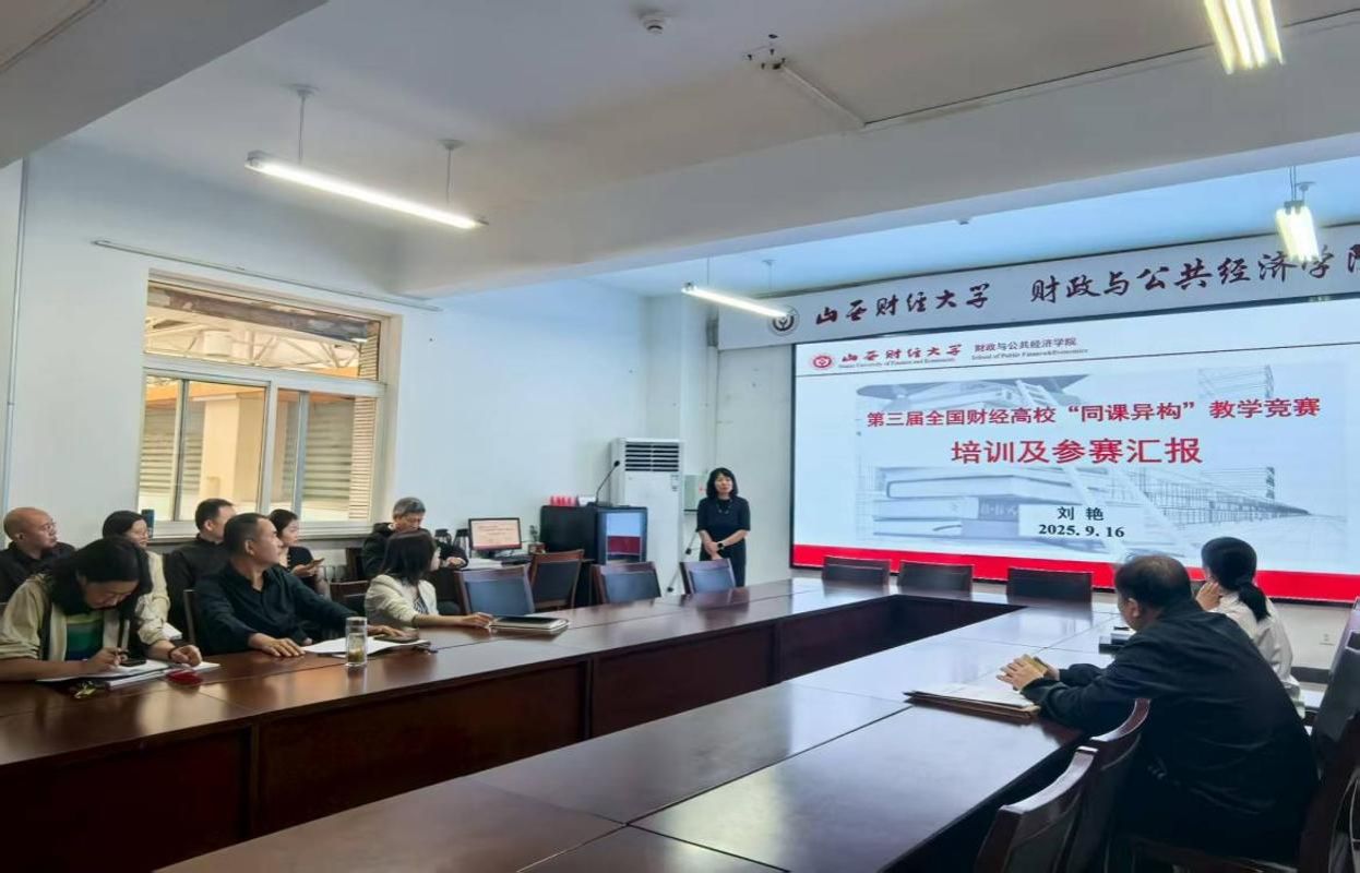 2025年9月16日,财政与公共经济学院刘艳老师于学院会议室,为全院教师进行了题为“第三届全国财经高校‘同课异构’教学竞赛培训及参赛汇报”的讲座。